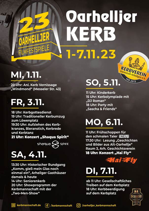 „Die Oarhelljer Kerb is do, was sin die Leit so froh!“ Die Zeit rennt und mit Ihr rückt auch der Start der Oarhelljer Kerb immer näher. Vom 1. bis 7. November startet die wohl schönste und längste Party in und um den Arheilger Löwen. Unter dem diesjährigen Motto „Oarhelljer Filmfestspiele“ laden Kerbverein und Kerbmannschaft herzlich in den Löwensaal und auf den Löwenplatz ein.
