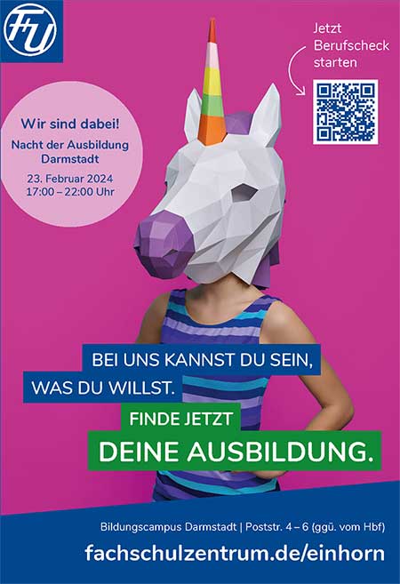 Viele weitere Informationen online unter www.fachschulzentrum.de/einhorn, gerne beraten die Mitarbeiter des Fachschulzentrum auch telefonisch unter 06151 8719-10. Bei der Nacht der Ausbildung Darmstadt am 23.2.24 kann man direkt vor Ort ein Bild machen. Einfach vorbeikommen ohne Anmeldung von 17 bis 22 Uhr.
