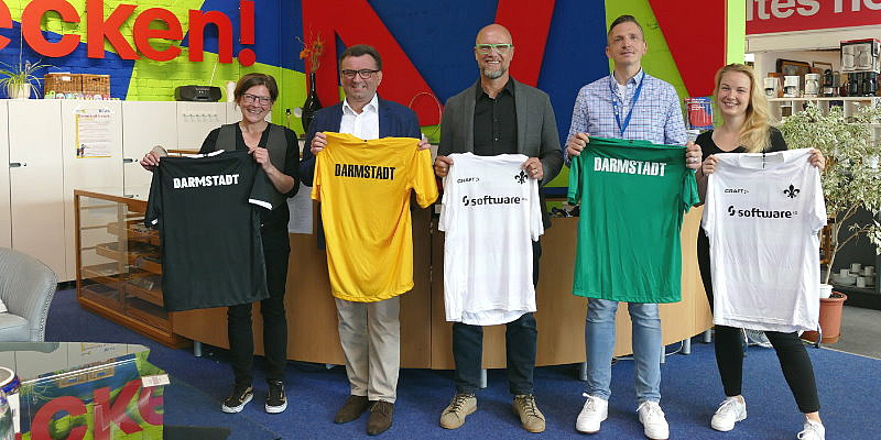 Ab Samstag, 15. Juni, können Fußballfans Aufwärmshirts der Lilien aus der Saison 2022/23 in Darmstadts Gebrauchtwarenkaufhaus KAGEL erwerben. Die ungetragenen Shirts wurden vom Geschäftsführer des SV Darmstadt 98 e.V., Martin Kowalewski, dem stellvertretenden Betriebsleiter des EAD, Frank Siemund, übergeben.