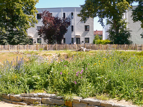 In Kooperation mit der Bauverein AG wurde in der Postsiedlung vor drei Jahren ein etwa 2000 Quadratmeter großes Biotop geschaffen. Hier blühen ökologisch wertvolle heimische Wildpflanzen, lebt eine große Wildbienen-Kolonie und flattern seltene Schmetterlinge.